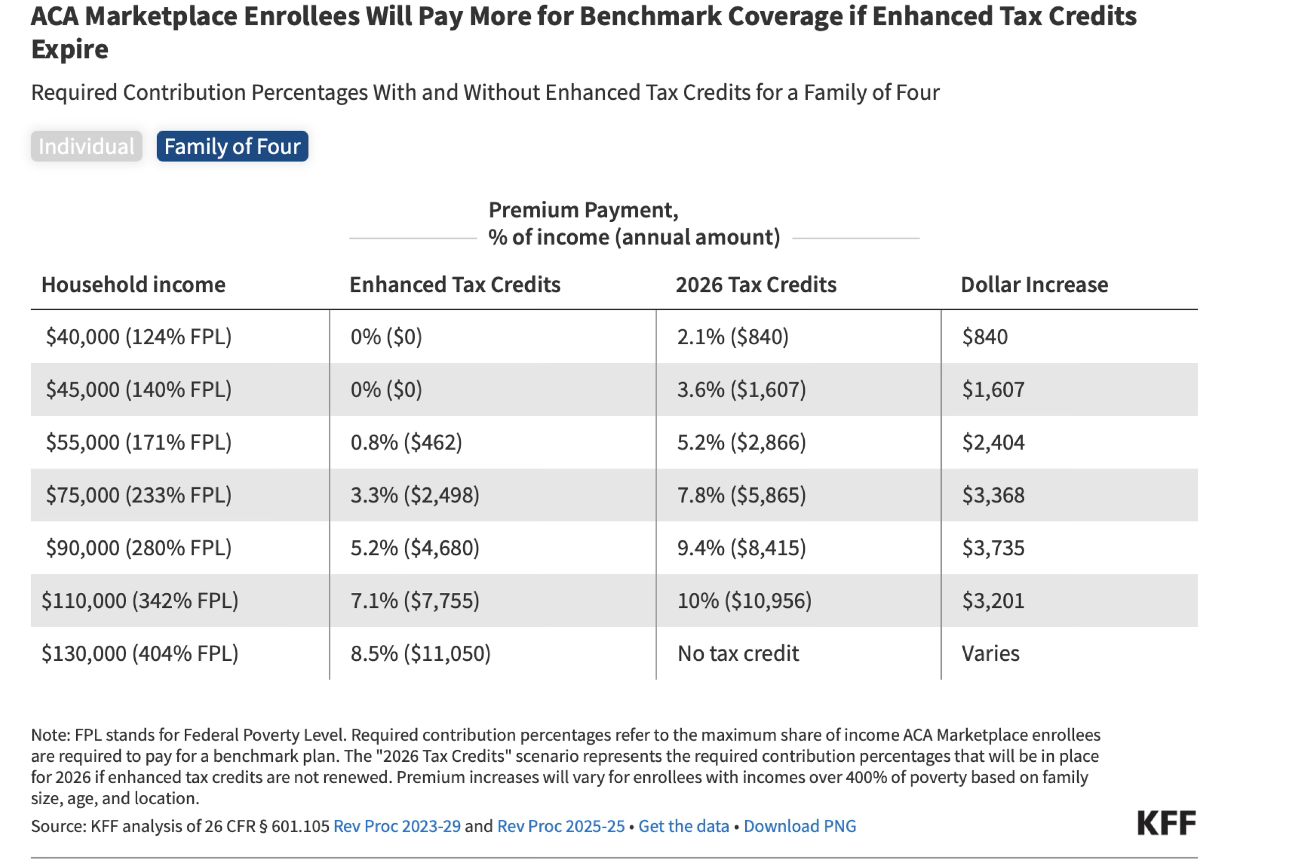 Its complicated! It depends on income and family size. Fortunately, the Kaiser Family Foundation has prepared charts (kff.org). One of the charts is shown below: the additional amount a four-member family will have to pay in 2026. The extra amount is the difference between the amount established during the Biden years in response to COVID-19 (Enhanced Tax Credits) versus the amount established in the OBBB (2026 Tax Credits). The amount varies by income, so, for example, a family earning $55,000 would have to pay an additional $2404 in 2026 for its health insurance.