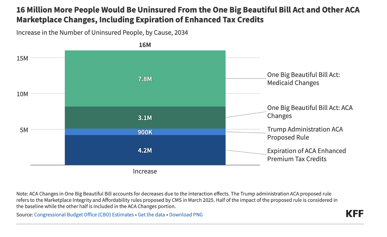 The October 15 post in Econ4Voters contained a chart from the Kaiser Family Foundation which showed how premiums will rise in 2026 for those who buy insurance in the Affordable Care Act marketplace. Rising premiums are only part of the impact of the OBBB. A much bigger impact are the total number of people who will be uninsured as a result of the OBBB.