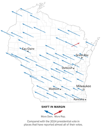 Below is a numerical version of the swing toward Democratic votes by counties that are of particular interest to us and by the counties that fall in whole or in part in Congressional District 1 — Bryan Steil's district — and Congressional District 3 — Derrick Van Orden's district.